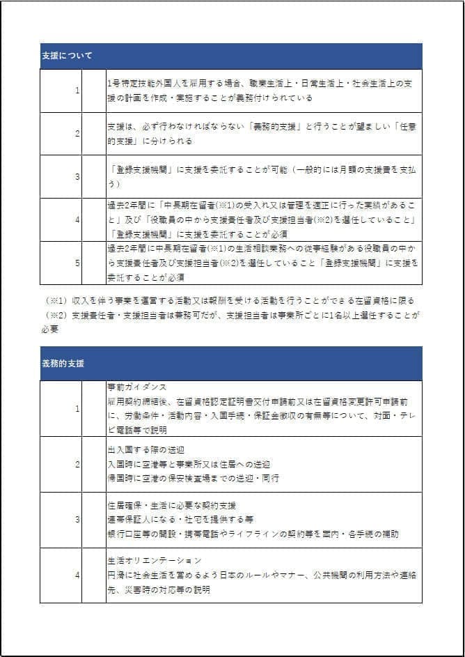 ○ 下記の10項目① 事前ガイダンス 在留資格認定証明書交付申請前又は在留資格変更許可申請前に、労働条件・活動内容・入国手続・保証金徴収の有無等について、対面・テレビ電話等で説明 入国時に空港等と事業所又は住居への送迎 帰国時に空港の保安検査場までの送迎・同行 連帯保証人になる・社宅を提供する等 銀行口座等の開設・携帯電話やライフラインの契約等を案内・各手続の補助 必要に応じ住居地・社会保障・税などの手続の同行、書類作成の補助 日本語教室等の入学案内、日本語学習教材の情報提供等 職場や生活上の相談・苦情等について、外国人が十分に理解することができる言語での対応、内容に応じた必要な助言、指導等 自治会等の地域住民との交流の場、地域のお祭りなどの行事の案内や参加の補助等 受入れ側の都合により雇用契約を解除する場合の転職先を探す手伝いや、推薦状の作成等に加え、求職活動を行うための有給休暇の付与や必要な行政手続の情報の提供 支援責任者等が外国人及びその上司等と定期的(3か月に1回以上)に面談し、労働基準法違反等があれば通報 |