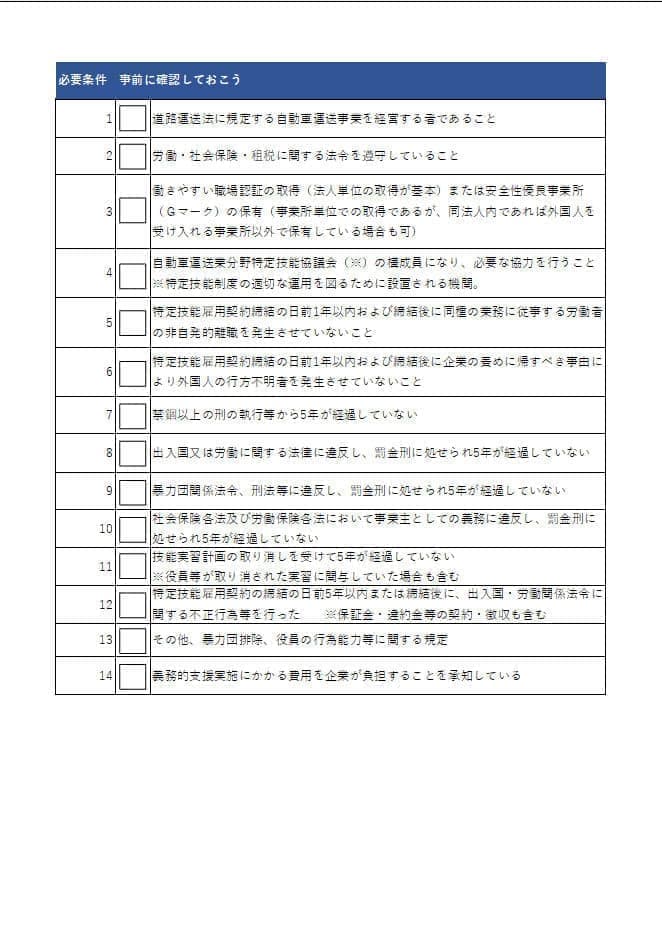 まず先に:チェックリストで確認しようそもそも外国人ドライバーを採用する条件にマッチしているのか?何をどれだけ用意しなければならないのか? |
