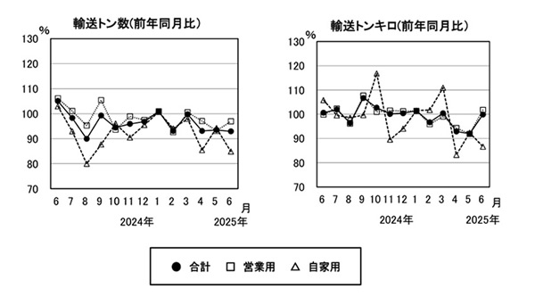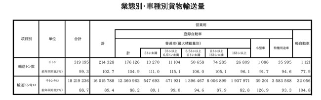 なお、営業用は185,601千トン(前年同月比6.9%減)、自家用は90,107千トン(前年同月比5.8%減)であった。